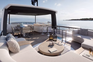 Ce système permet au tableau arrière ouvrant de s’aligner avec le bord arrière du pont principal, transformant le cockpit du yacht à moteur en une vaste terrasse au bord de l’eau.