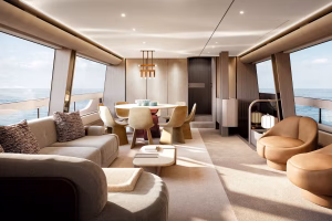 À l’intérieur du superyacht, Fantolino poursuit sa collaboration avec Azimut pour un troisième projet, façonnant les intérieurs autour d’un style à l’élégance douce, empreint d’harmonie et d’équilibre.