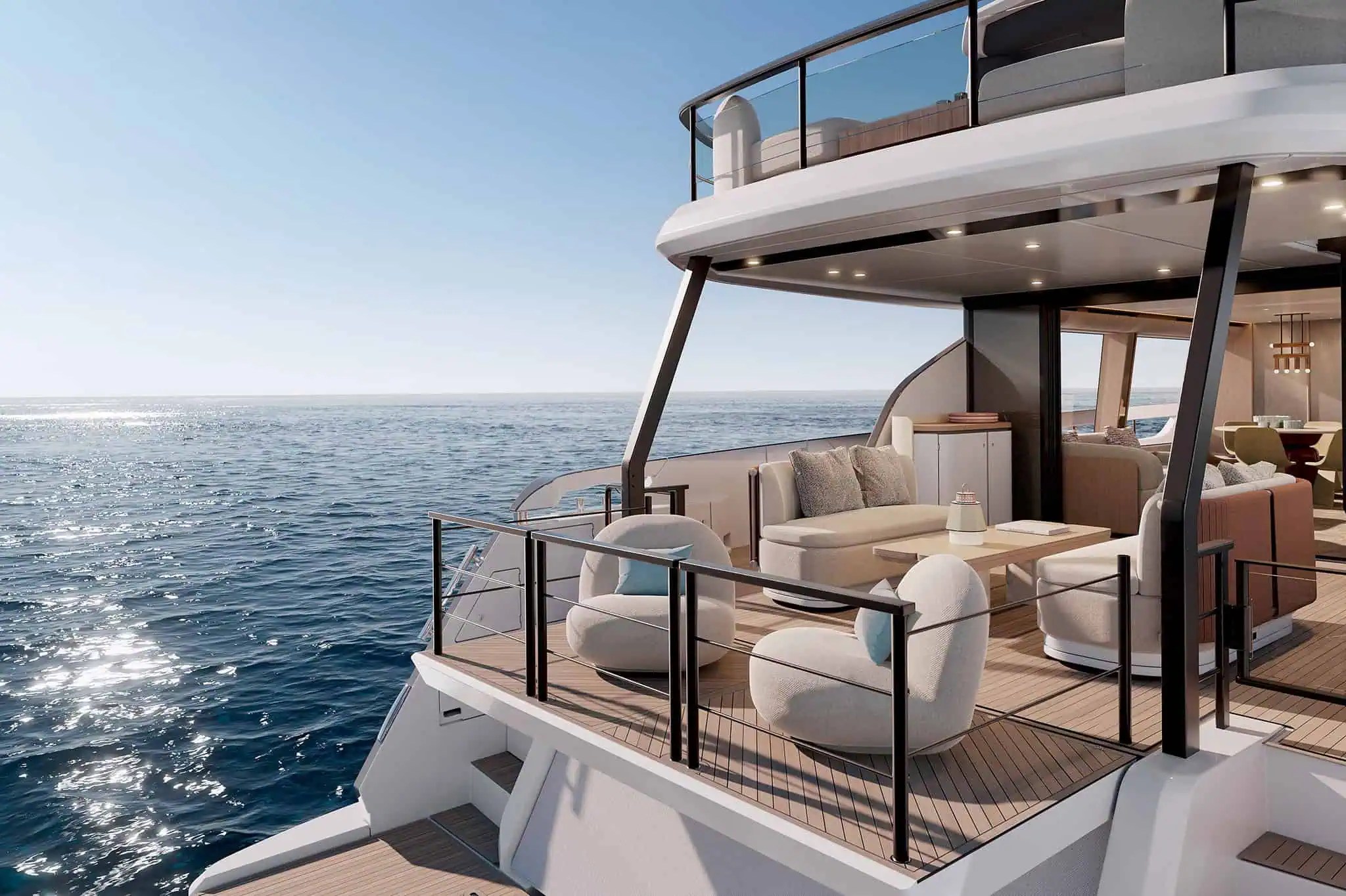 Ce système permet au tableau arrière ouvrant de s’aligner avec le bord arrière du pont principal, transformant le cockpit du yacht à moteur en une vaste terrasse au bord de l’eau.