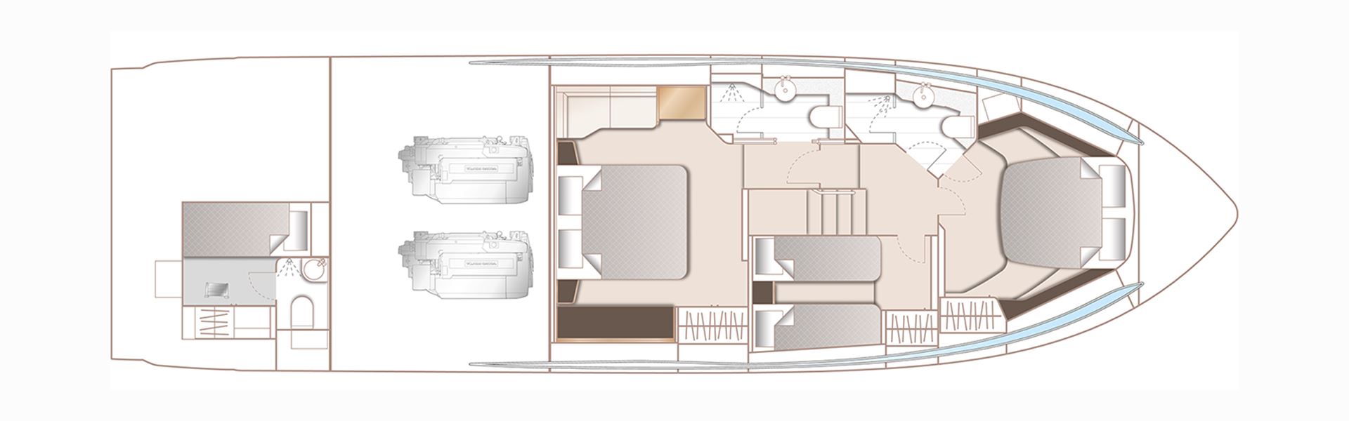 Au pont inférieur, six personnes se répartissent confortablement entre la cabine du propriétaire, aménagée sur toute la largeur du yacht et dotée d’une salle de bain particulière, et deux autres cabines d’invités.