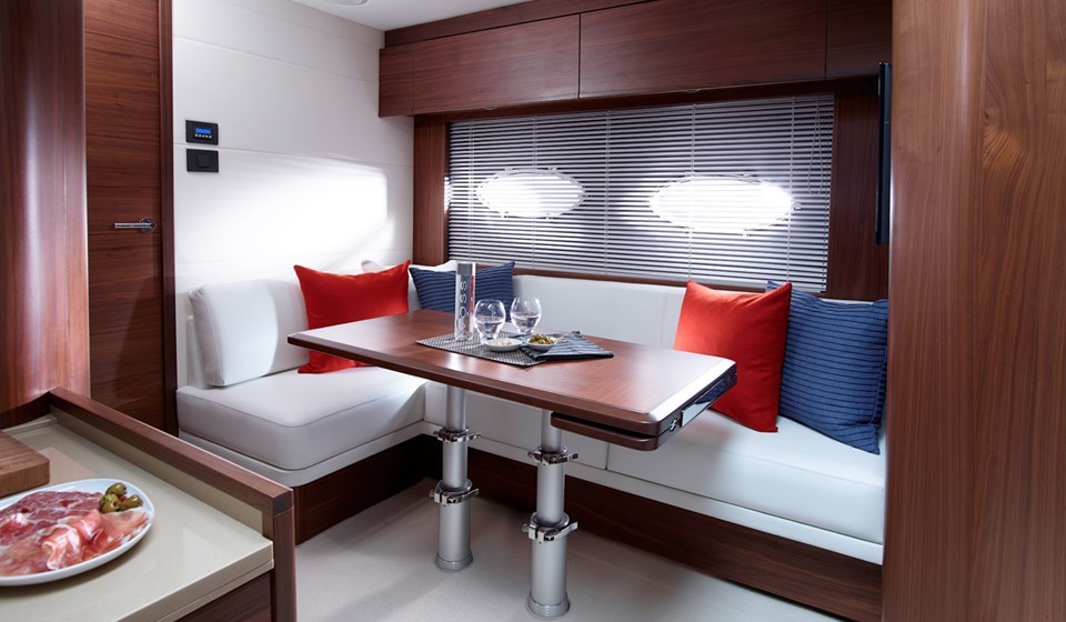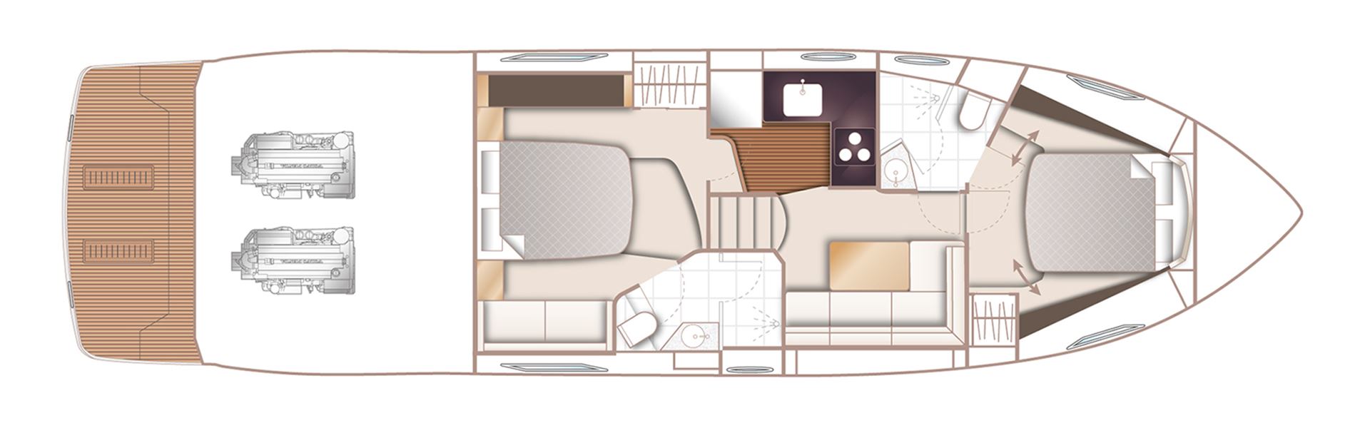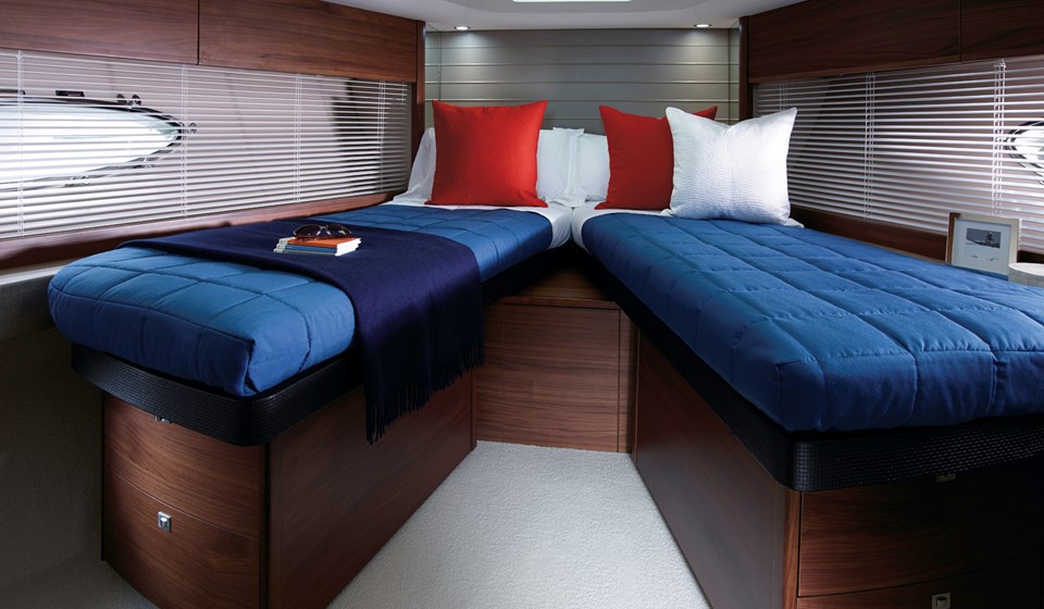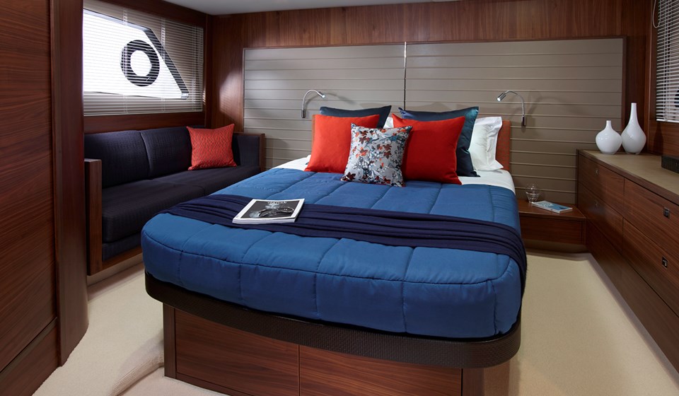 Le superbe salon du pont inférieur (lower deck), qui peut être soit un espace de réception, soit une troisième cabine accueillante, est aussi un exemple de flexibilité et d’innovation. La cabine du propriétaire est un sanctuaire magnifiquement aménagé et la cabine avant pour les invités est équipée en option de deux couchettes disposées en biais et de hublots ovales pour que la lumière tienne compagnie à vos invités lors de leur séjour.
