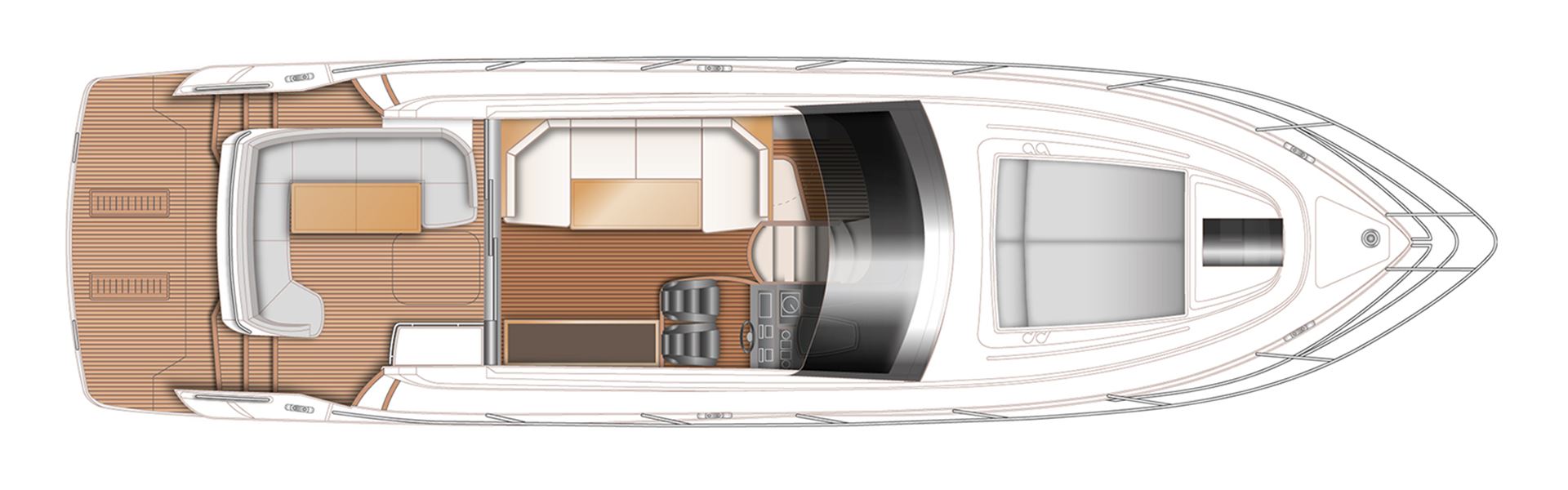 Comme toujours avec Princess, votre choix personnel est primordial. C’est le cas pour le spacieux et somptueux V48, qui offre l’option d’un plan ouvert (sans porte patio), avec cockpit sur toute la longueur et toit ouvrant, ou bien comme modèle avec salon de pont fermé et climatisé (avec porte patio). Quel que soit votre choix, vous êtes assuré de vivre des sensations enivrantes, avec jusqu’à 34 noeuds de puissance au bout des doigts.