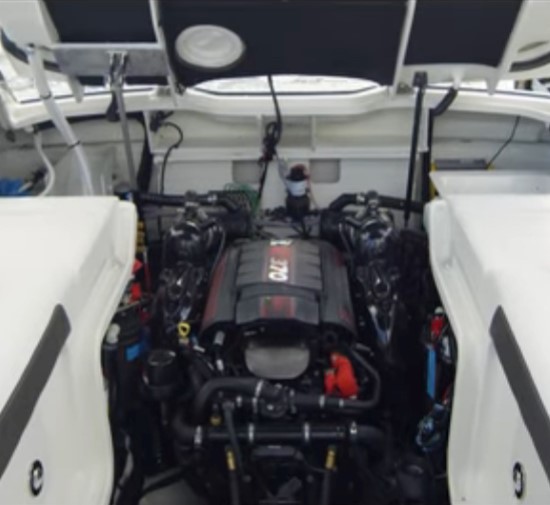 Il est propulsé par un Mercruiser 6.2L qui développe 370 hp avec un shaft (V-Drive). Il possède bien sûr un système de ballast qui permet de créer le type de vague qu’on désire. Il possède le système : Dynamic Running Surface avec le Wake Shaping Tab system avec écran de contrôle tactile complet dans le tableau de bord du pilote.